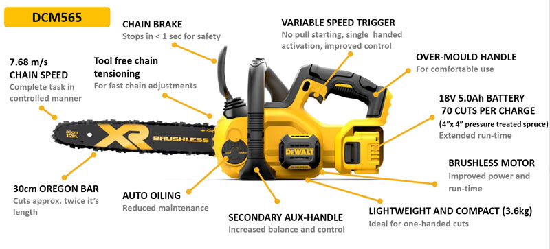 The DCM565 20V/18V Compact Chainsaw is a versatile tool that can be used in either outdoor or construction applications. Featuring a 30cm Oregon Bar and Chain, the DCM565 is equally effective at cutting logs as it is trimming timber beams in confined spaces. Lightweight and easy to manoeuvre , the DCM565 benefits from a large auxiliary handle, auto-oiling and tool free bar and chain replacement. Bare unit, batteries and charger sold separately.
