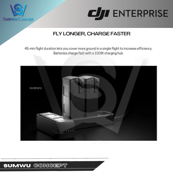 It takes the DJI USB-C Power Adapter (100W) or the DJI Mavic 3 Battery Charging Hub (100W) approximately 70 minutes to fully charge an intelligent battery, and approximately 50 minutes to charge it to 90%. The powerful fast charge design meets the need for continuous operation and increased efficiency.