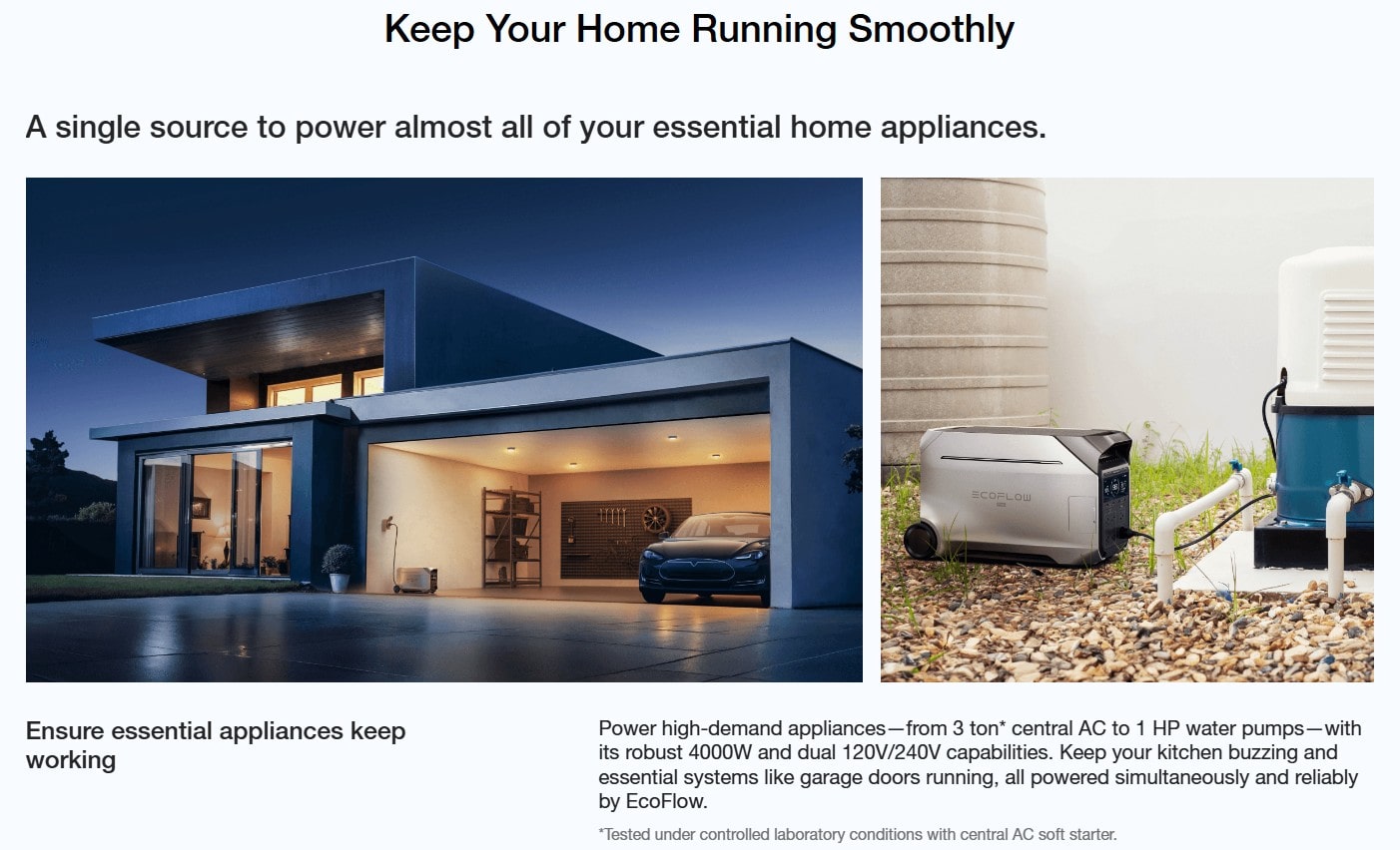 【Energize Almost Everything】 The EcoFlow DELTA Pro 3 supports 120V/240V voltage and has a 4000W output (6000W with X-Boost, scalable up to 12000W), powering nearly all essential home appliances, such as a 3-ton* central AC or a 1 HP water pump.