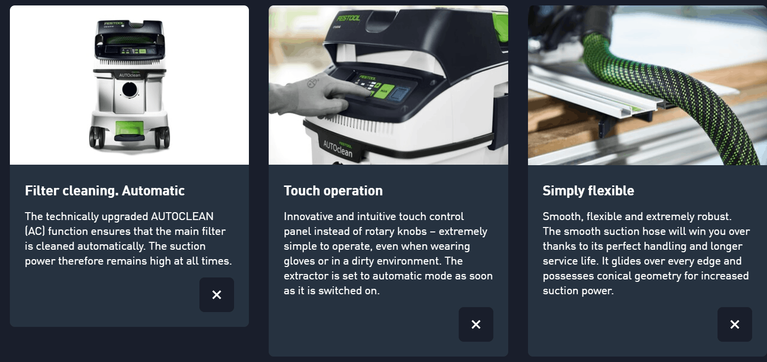 - Automatic electrical outlet module: For corded power tools. Starts up the power tool and automatically starts up your extractor too.