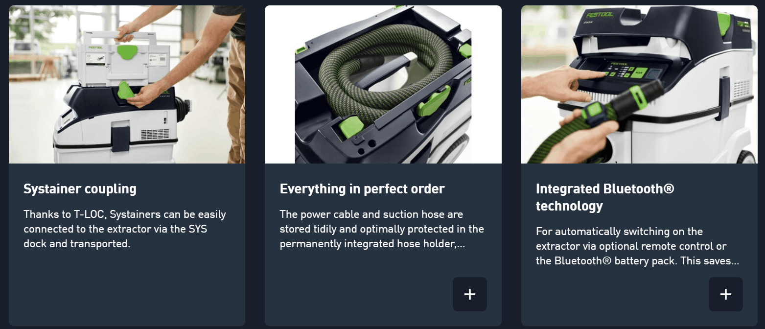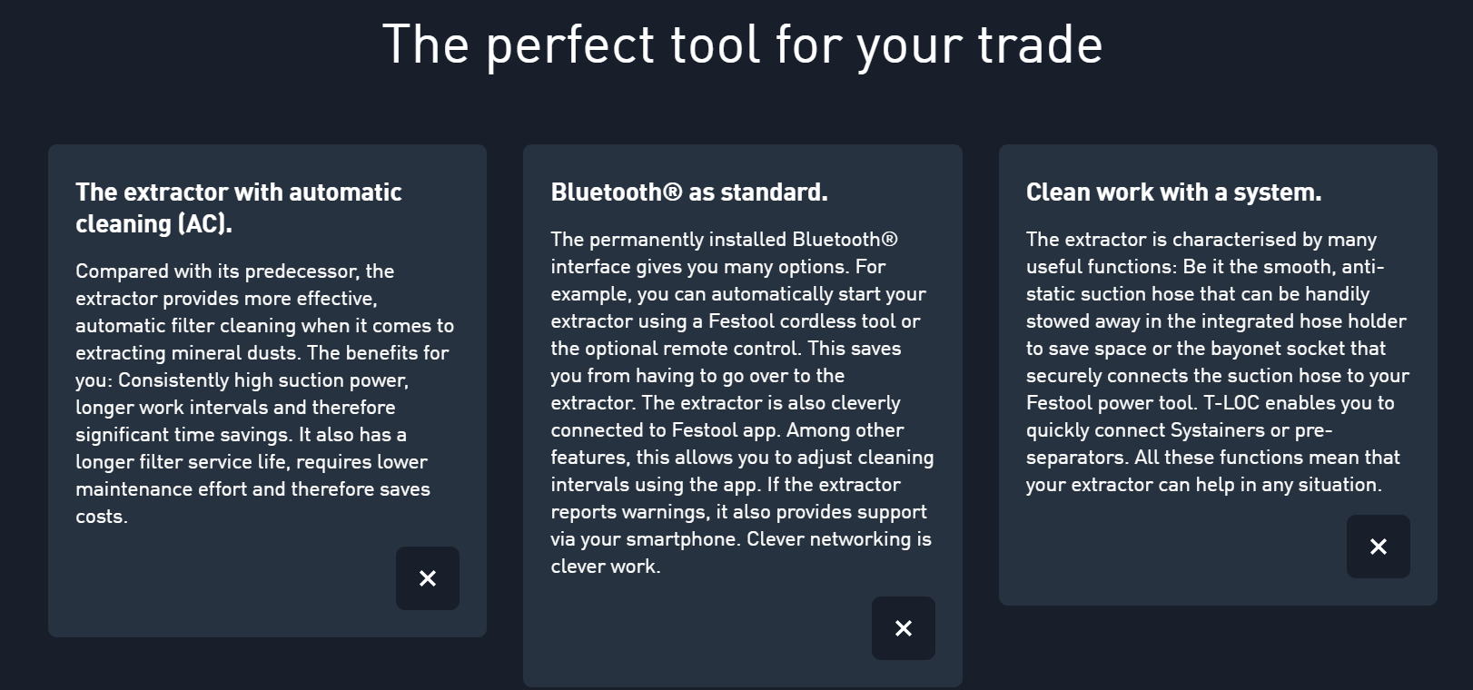 - Bluetooth® functionality for extractor, remote switch-on for cordless tools