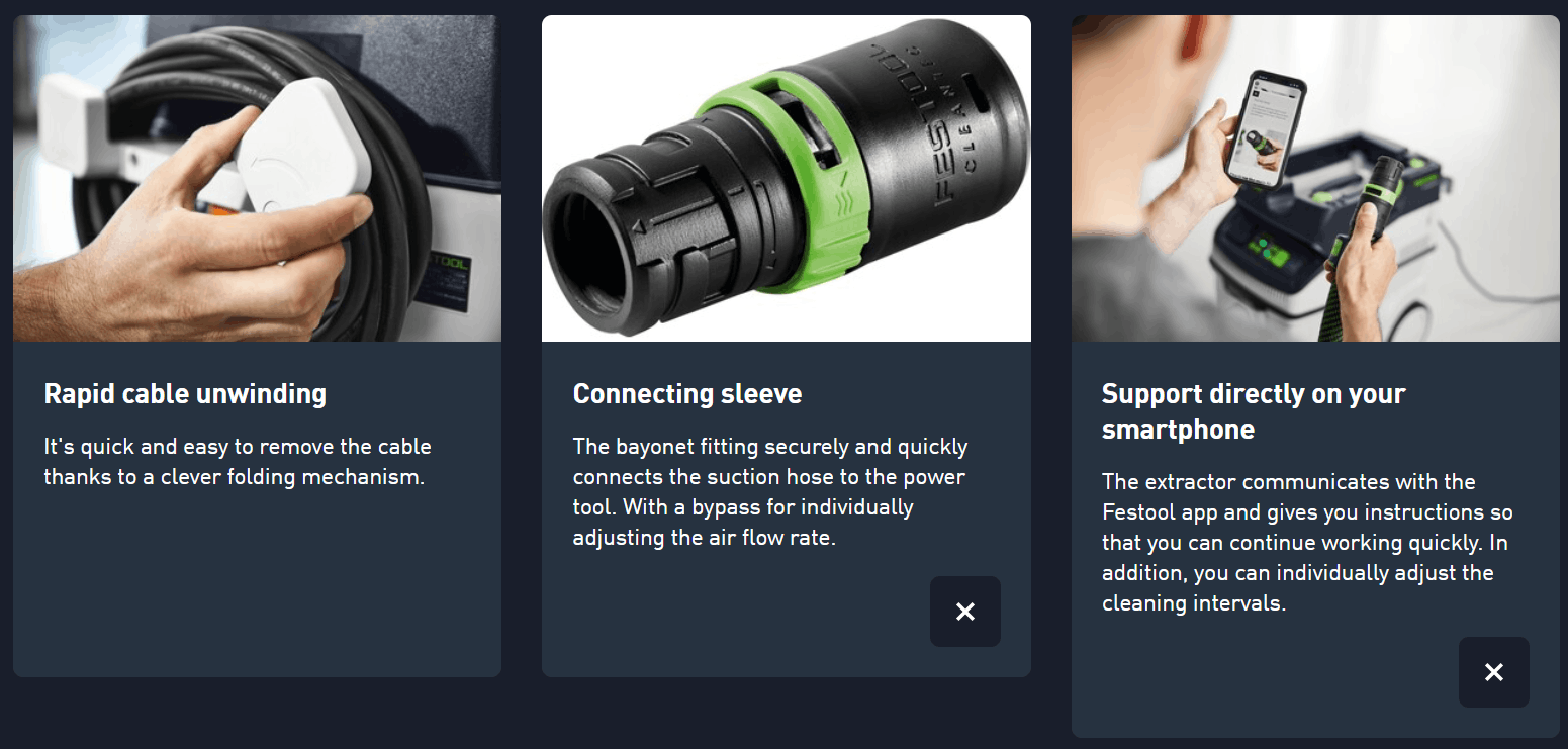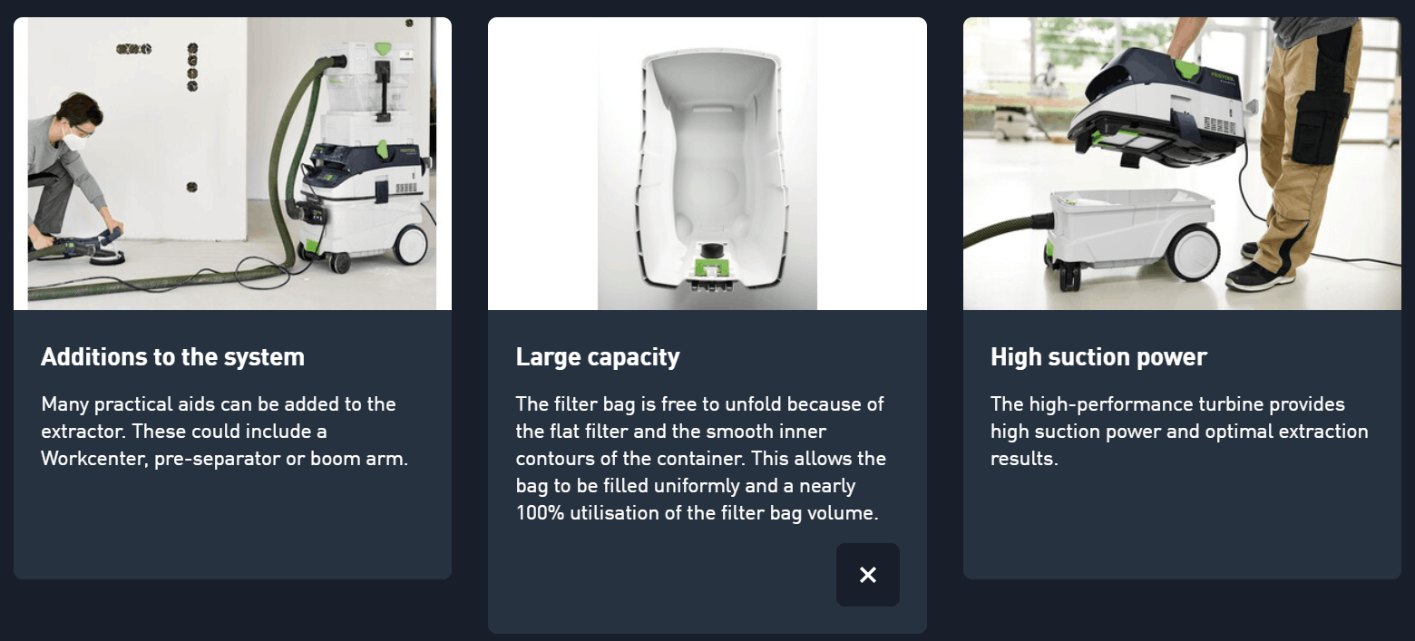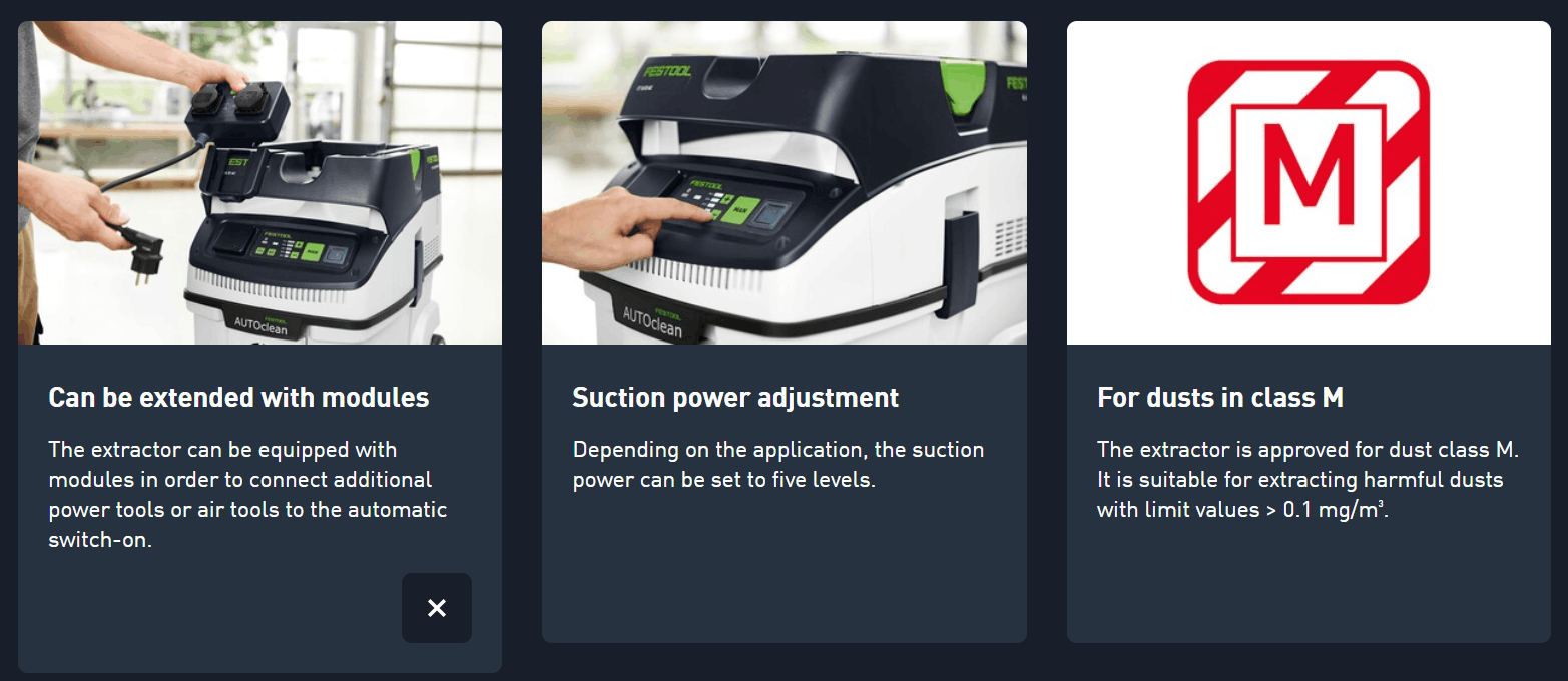 - Automatic electrical outlet module: For corded power tools. Starts up the power tool and automatically starts up your extractor too.