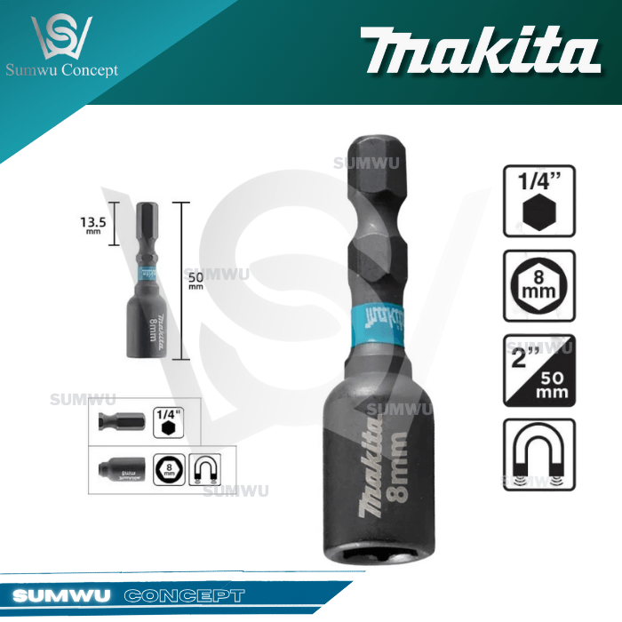 IMPACT BLACK Series product with a strong, rust-proof black design, shock-absorbing slot to protect the adapter and highlighted by a branded blue plastic ring. Featured Makita standard 6.35mm hex shank design (long standard) suitable for Asian screwdrivers. It features negative hexagonal head, magnetic.