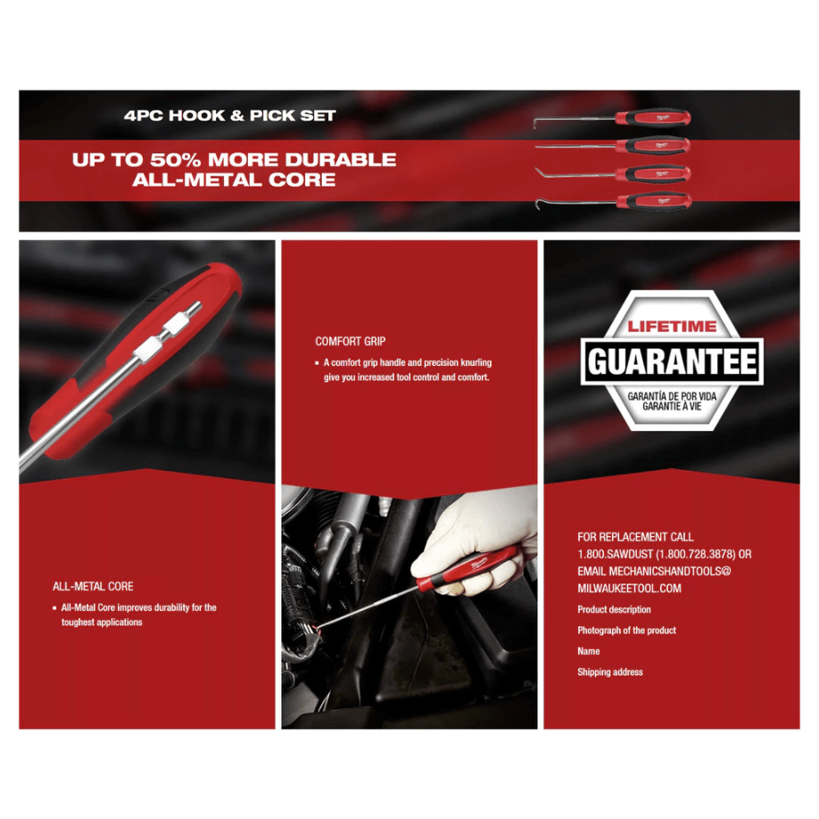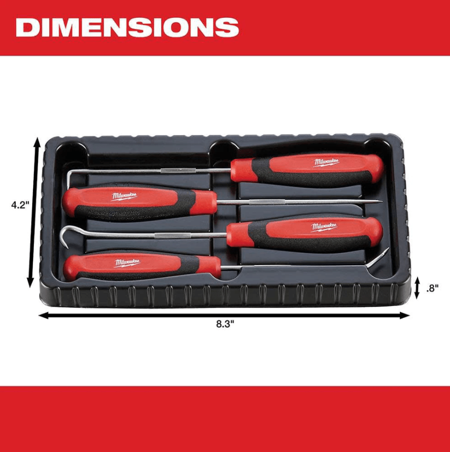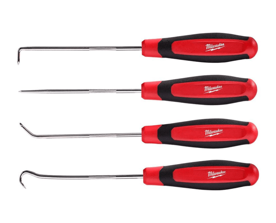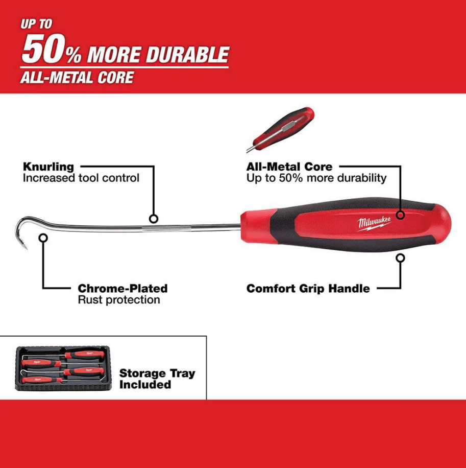 MILWAUKEE four-piece Hook & Pick set features an All-Metal Core for up to 50% more durability. Chrome-plated shanks reduce corrosion on the hooks and picks while providing superior rust protection. A comfort grip handle and precision knurling give you increased tool control and comfort. The kit features a straight pick, offset hook, o-ring hook, and 90° right angle hook give you versatility for a variety of mechanic and automotive uses. Finally, the hook and pick tool set comes in an easy-access storage tray for long-term tool storage.