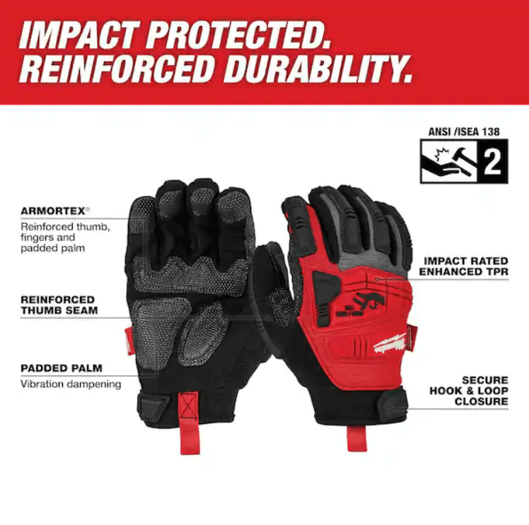 MILWAUKEE® Impact Demolition Gloves are designed with Impact Protection and Reinforced Durability. Featuring TPR on the back of the hand and fingers, that helps prevent against back of hand injuries. A Padded Palm for increased protection and vibration reduction. This durable glove is ideal for construction work, demolitions and material handling.