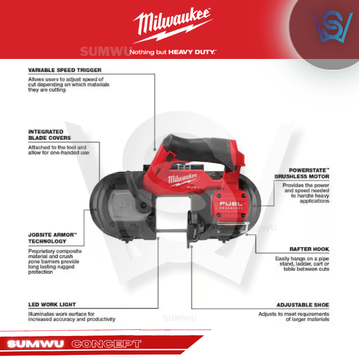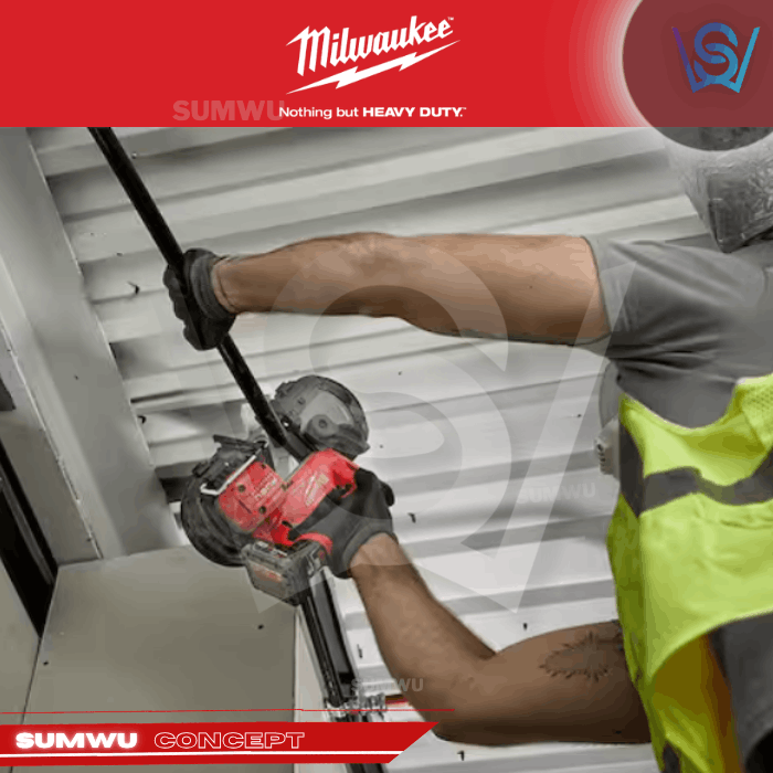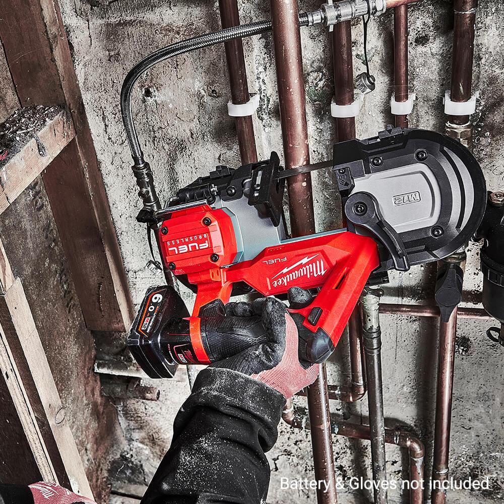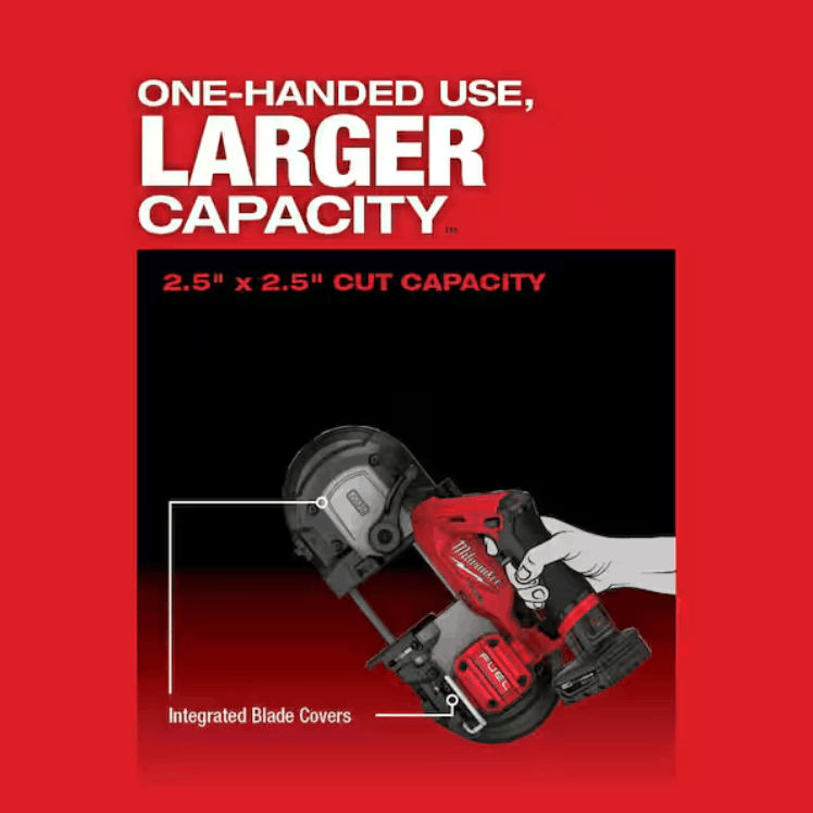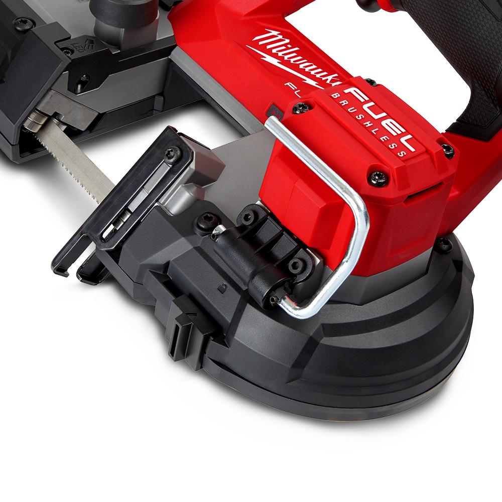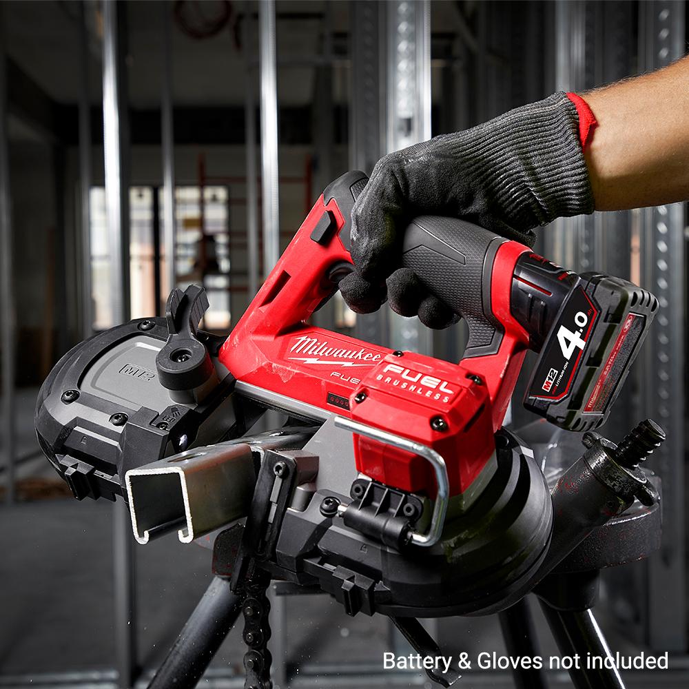 The M12 FUEL Band Saw utilises a POWERSTATE Brushless Motor and Constant Power Technology for fast cuts and has a cutting capacity of 63.5 x 63.5 mm (2-1/2″ x 2-1/2″). The lightweight design, at only 2.7 kg plus M12 REDLITHIUM-ION Battery (sold separately) is optimized for one-handed use and is suitable for overhead cuts. The M12 FUEL Band Saw features integrated blade covers, making it suitable for one-handed use while offering a larger capacity than the previous generation M12 Band Saw. The improved performance, lightweight design, one-handed capability, and increased capacity enhance your productivity while lowering fatigue. The band saw is equipped with proprietary composite material to better protect the tool from drops and debris, with crush zone barriers that absorb impact on the job site.