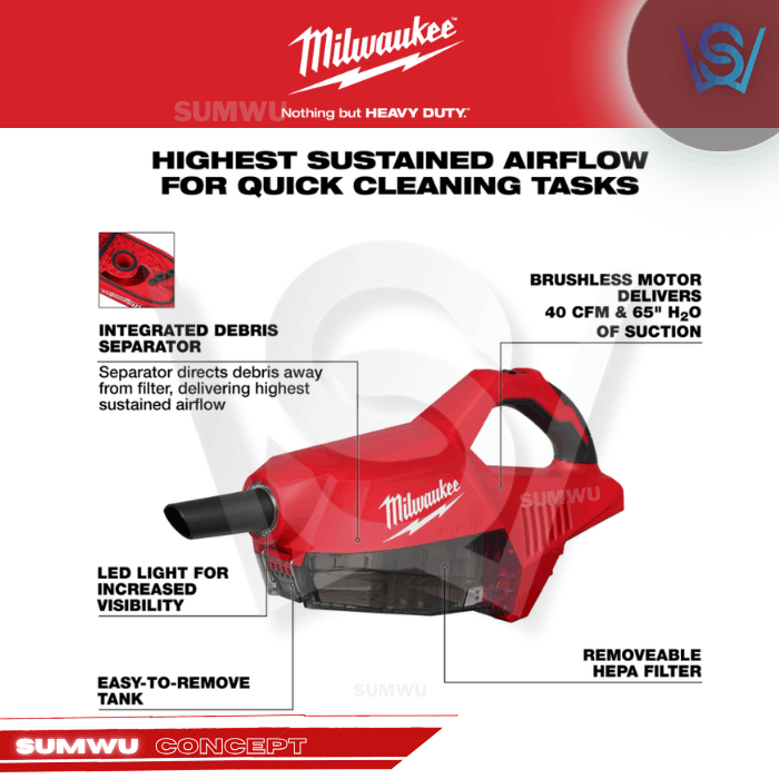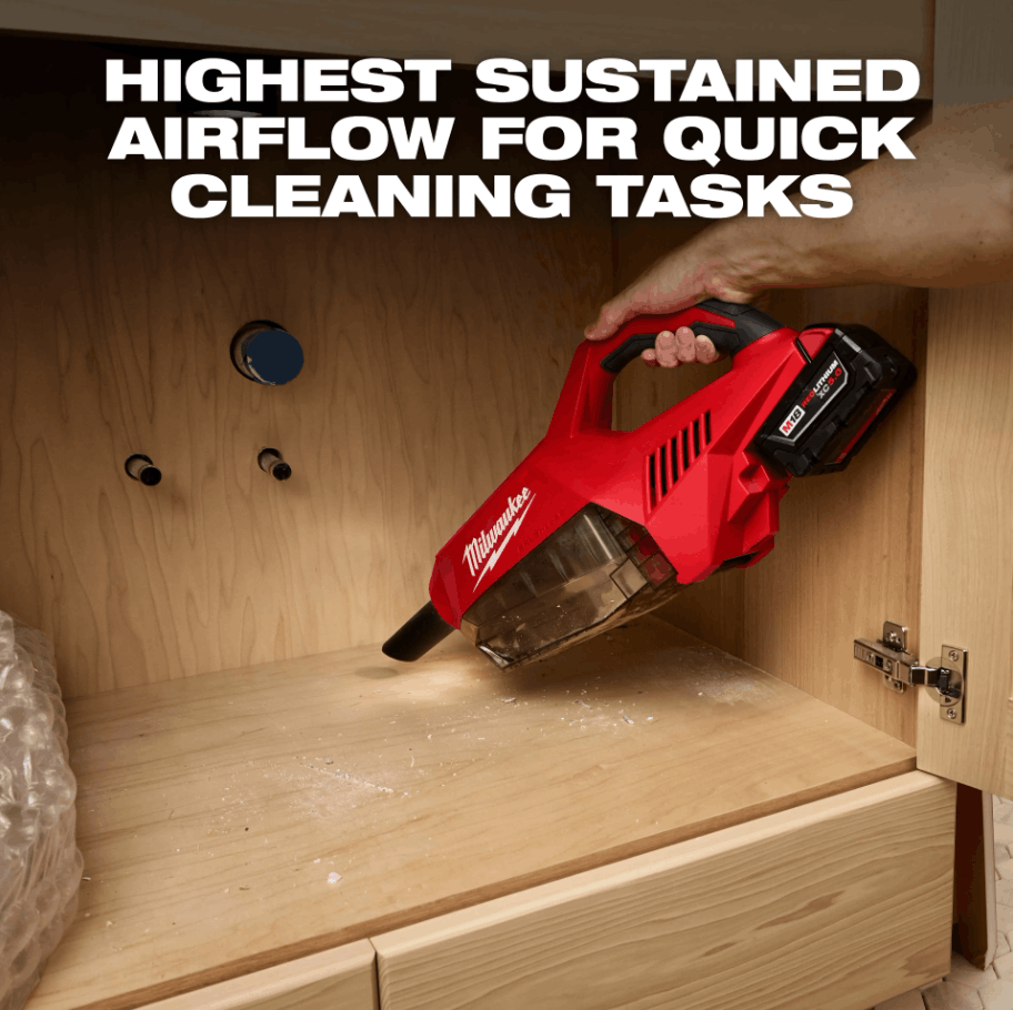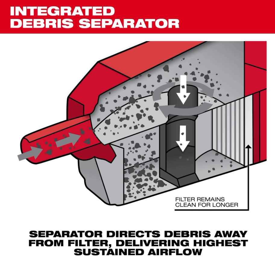 Milwaukee M18™ Brushless Handheld Vacuum is a quick and effective cleanup solution for a variety of jobsite conditions. With its ergonomic form factor and comfortable handle design, this product is optimized for quick cleaning tasks. The integrated debris separator provides the highest sustained airflow during the cleanup of sawdust, drywall dust, wood shavings, metal shavings, and other common jobsite debris. This technology significantly reduces the downtime spent cleaning filters and performing vacuum maintenance. Equipped with a high-performing brushless motor, the vacuum delivers 40CFM and 63 inches of suction. When paired with an M18™ REDLITHIUM ™ XC5.0 Battery pack, this handheld vacuum delivers over 20 minutes of runtime. For increased visibility in dimly lit jobsite environments, the vacuum has an LED ring located around the nozzle, providing shadowless lighting. For quick disposal of debris, the M18™ Brushless Handheld Vacuum has an easy-to-remove tank design, composed of dedicated tank grip points and a quick-release latch. The included HEPA filter ensures the collection of fine dust and debris.