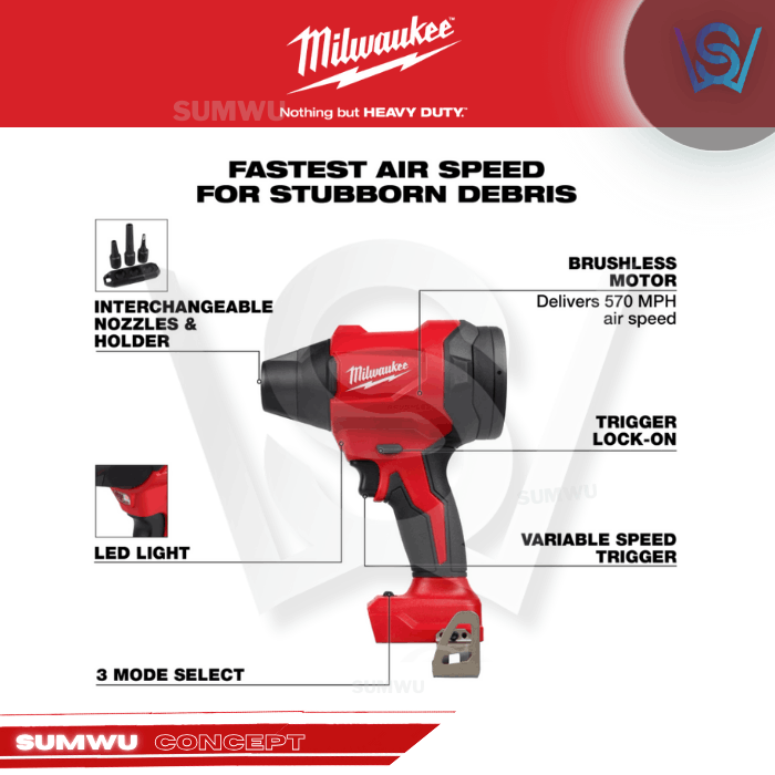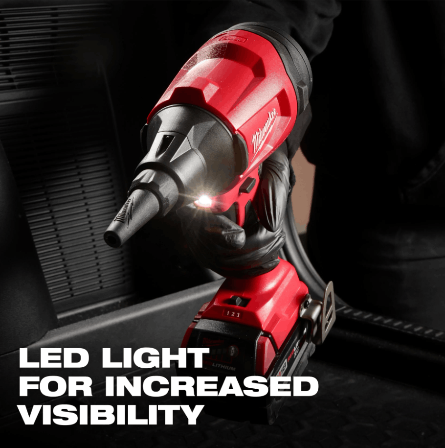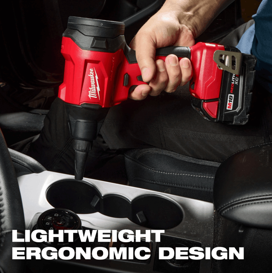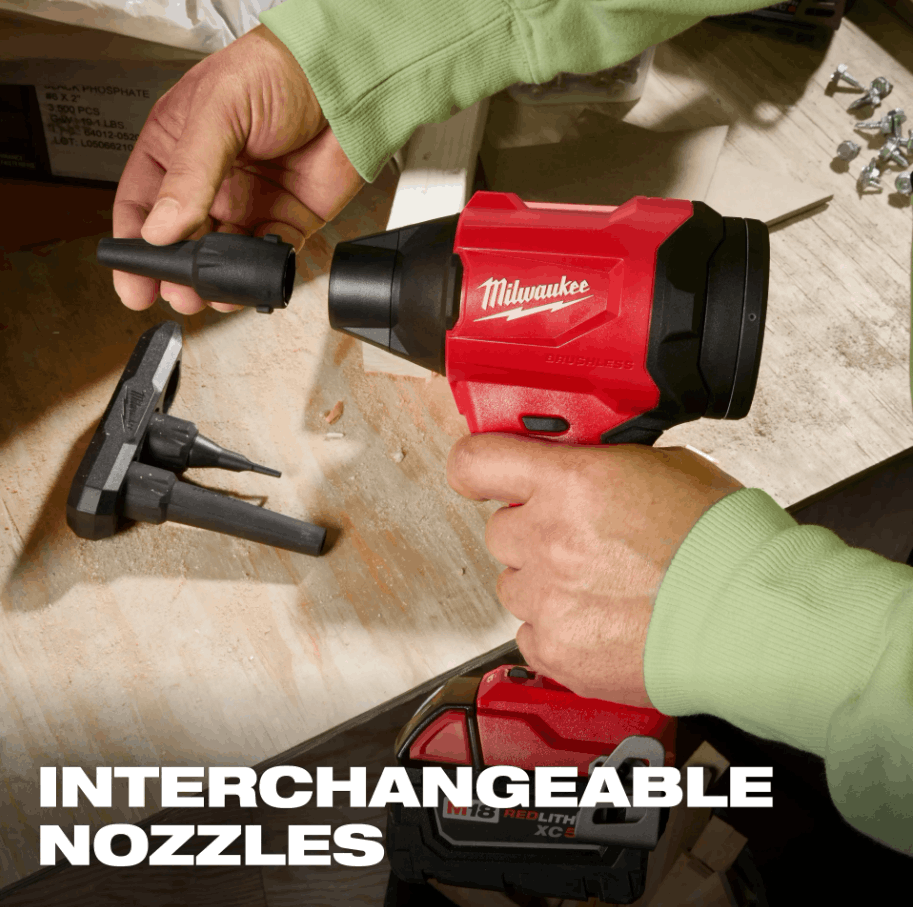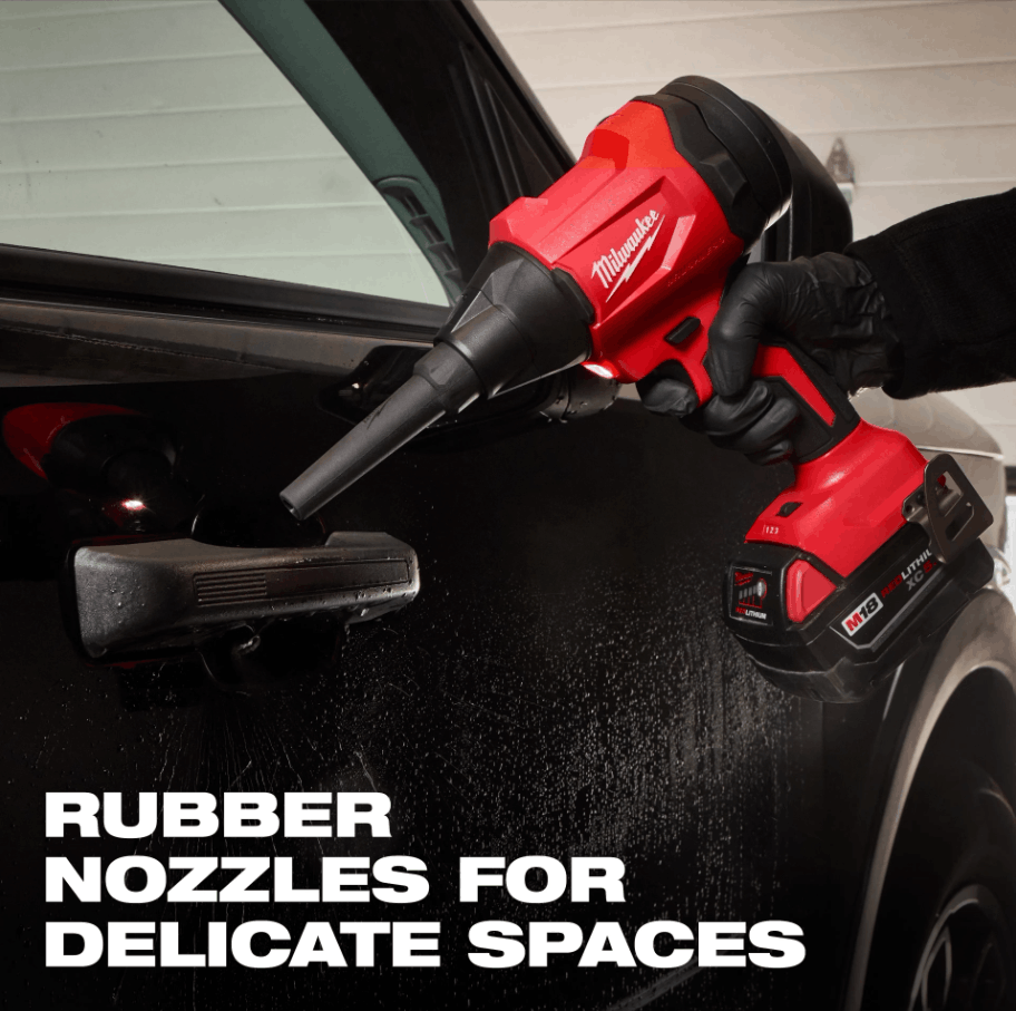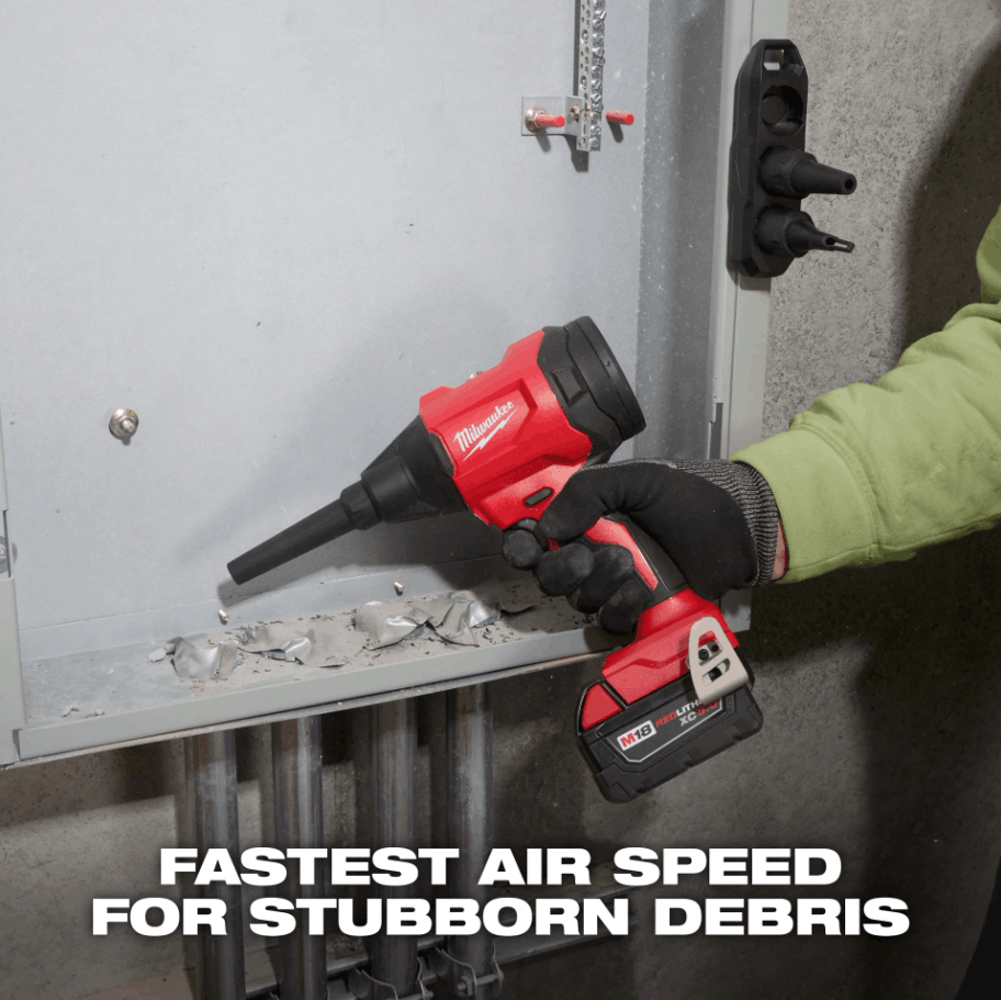 Milwaukee M18™ Brushless Precision Blower delivers the Fastest Air Speed for Stubborn Debris, commonly found in hard-to-reach or hard-to-clean places. Equipped with 3 distinct power modes and a variable speed trigger, this high-speed blower offers ultimate control of air performance. On MAX POWER MODE, the Brushless Motor delivers 570 MPH and up to 39 CFM, providing the power to clear stubborn jobsite debris effectively. With an M18™ REDLITHIUM™ XC5.0 battery pack in MAX RUN-TIME MODE, this blower delivers over 30 minutes of run-time, ideal for common job site tasks. With a unique form factor, this handheld, compact blower is only 7” long and 2 lbs, ergonomically designed for convenient cleanup in various environments. Equipped with an integrated LED light to illuminate work surfaces, this tool provides greater visibility when cleaning dimly lit spaces. The tool has a trigger lock-on switch to reduce user fatigue in extended cleanup applications. There are (3) kitted interchangeable nozzles for added versatility: a short 6mm nozzle, a long 10mm, and an inflator nozzle. All nozzles are made of a durable rubber material designed for cleaning in sensitive applications and are easily interchangeable with a quarter-turn design. The kitted nozzle holder has magnets, hang holes, and a lanyard loop for convenient and versatile storage.