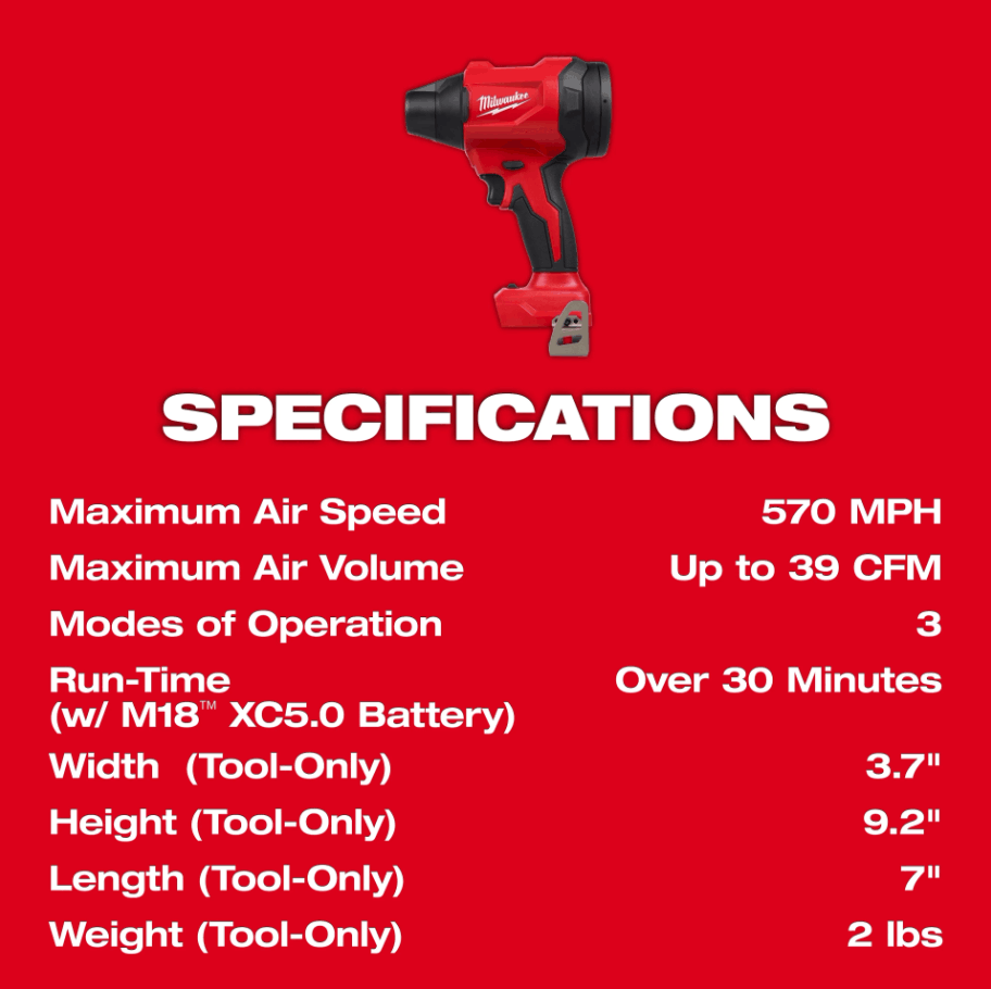 – Brushless Motor delivers 570 MPH Air Speed and 39 CFM