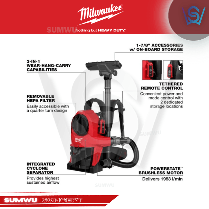 The Milwaukee M18 backpack vacuum brings unmatched versatility and mobility to job site cleanup with its unique form, this product is optimised for extended floor and overhead cleaning, among other everyday job site cleanup tasks. This cordless 3-in-1 backpack vacuum comes equipped with an integrated cyclone debris separator to maintain productivity and reduce downtime spent cleaning filters. Safe and secure shopping online with big red power tools. The Milwaukee M18 FUEL backpack vacuum is the best cordless backpack vacuum cleaner delivering 1,980 L/min of air flow and 137 mbar of suction for effective cleanup of common job site debris and 3-in-1 design for Wear-Hang-Carry capabilities, this vacuum delivers ultimate versatility for various cleanup tasks and provides added comfort with a padded harness and an ergonomic handle design. The Milwaukee M18 FBPV2 cordless backpack vac has the runtime to tackle most jobs with over 40 minutes or up to 125m² of continuous cleaning per charge when paired with Milwaukee premium M18 Forge 8.0Ah battery pack to tackle the dirtiest of jobsites.