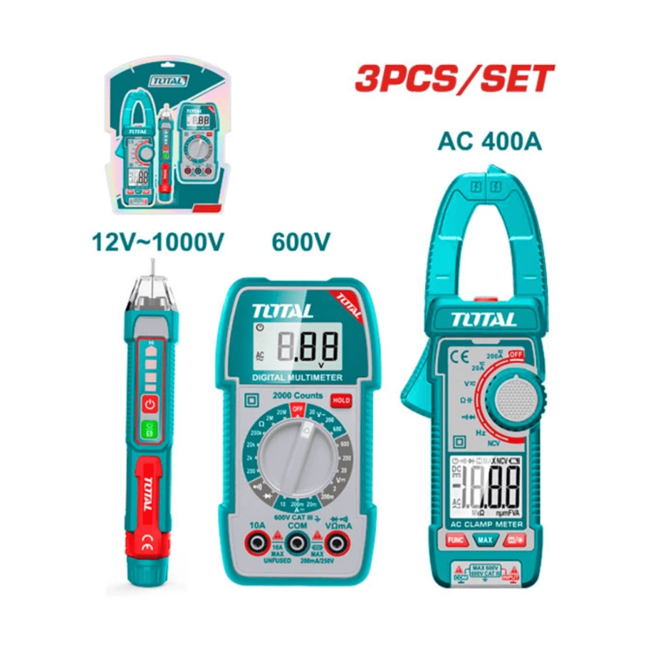 TOTAL 3 PCS ELECTRICAL TEST KIT COMBO SET. 电工测试套件 (DIGITAL AC CLAMP METER, AC VOLTAGE DETECTOR, DIGITAL MULTIMETER BATTERIES) TOS23068