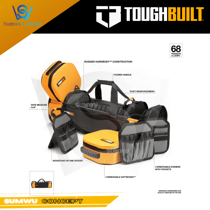 Its 68 versatile pockets and loops include structured external pockets that flex to securely hold tools, level straps on the back, and a large variety of pockets on the dividers fit a professional’s tools. Made with rugged HardBody™ construction and heavy-duty rivet reinforcement, this hard-working tote keeps up with the professional’s rigorous demands.