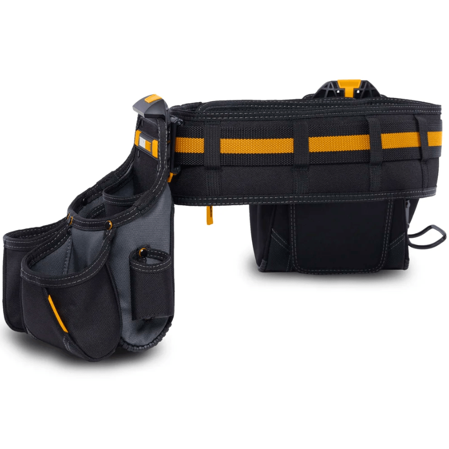 The ToughBuilt® 3-piece Tradesman Tool Belt Set is designed to increase a professional’s organization and efficiency. Our innovative ClipTech™ technology provides 2 durable pouches that are adjustable, interchangeable and effortless to clip on and off the belt, allowing you to carry only what you need, when you need it. And each pouch includes an integrated kickstand so you can stand the pouch by itself on the floor, a tabletop or almost any other flat surface. 27 customized pockets and loops include 5 large-capacity pockets with No-Snag Hidden-Seam design, a notebook pocket, extreme-duty hammer loop and 2 tape measure clips. The padded toolbelt combines comfort and durability with rugged, 6-Layer Construction, strong rivet reinforcement and a heavy-duty buckle so it can stand up to your toughest jobs.