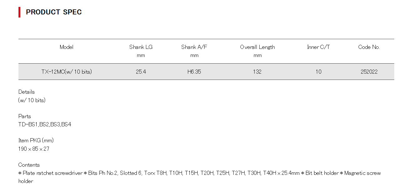 Set Includes: Plate ratchet screwdriver, Bits Ph No.2, Slotted 6, Torx T8H, T10H, T15H, T20H, T25H, T27H, T30H, T40H x 25.4mm, Bit belt holder, Magnetic screw holder
